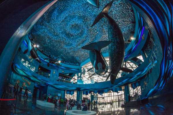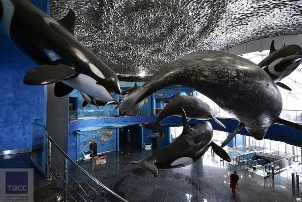 Холл океанариума украшен муляжами крупных морских обитателей (серые киты и косатки)