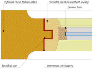 Элементы обсады должны иметь ширину не больше 26 сантиметров, чтобы не возникали трещины. Для изготовления коробки берут материал с влажностью от 10%, если этот показатель будет ниже, внутри возникнут трещины. При изготовлении окосячки не пользуются гвоздями и аналогичными предметами. Чтобы создать герметизацию в промежуток между бревном и основой окна, помещают теплоизоляцию. В качестве уплотнительного материала нельзя применять пену, так как происходит скрепление бревен, и они не усаживаются естественным путем, поэтому лучше использовать льняную ткань или джутовое волокно.