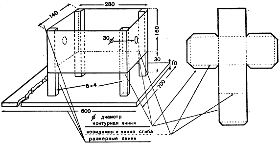 Иногда, особенно по изделиям из бумаги и картона, вместо чертежа готовой вещи дается развертка ее. Такую развертку по указанным размерам чертят на бумаге или картоне, затем вырезают и сгибают. Места сгибов на развертке показывают также пунктирными линиями — такими же, как невидимые контуры предметов на чертежах.
