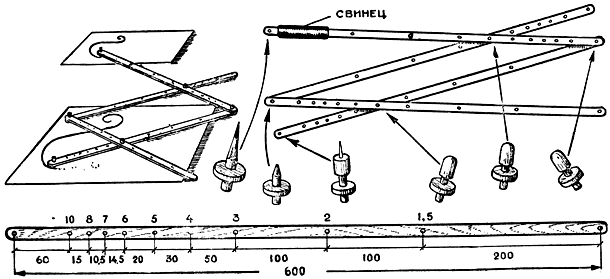 Изготовление пантографа упростится, если приспособить его для немногих увеличений: например, только в два с половиной и десять раз. Отверстий в этом случае придется сверлить меньше.