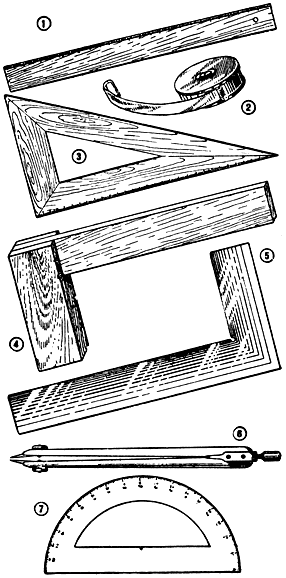 1 — линейка масштабная; 2 — карманная рулетка; 3 — треугольник ученический; 4 — угольник столярный; 5 — угольник слесарный; 6 — циркуль; 7 — транспортир.