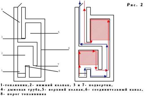 Примерно 80% всего тепла остается в первой камере 2. Благодаря этому происходит более равномерный прогрев отапливаемого помещения. Для повышения эффективности печи иногда нижнюю часть, на рисунке до подвертки 3, одевают в железо. Такой железный футляр выполняет функцию отведению тепла, а кроме того является дополнительной герметизацией.
