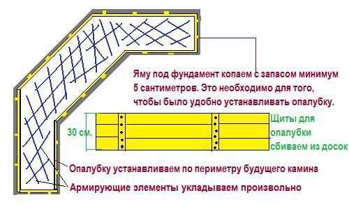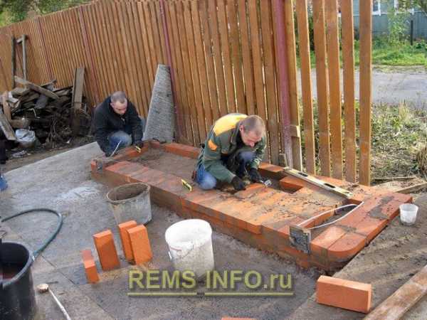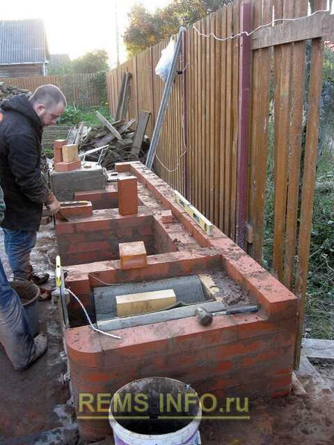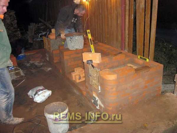 Любите готовить шашлыки и другую пищу на свежем воздухе, но до сих пор не имеете собственного барбекю? Предлагаем вам прямо сейчас исправить сложившуюся ситуацию! Изучив следующую инструкцию, вы узнаете, в какой последовательности выкладывается полноценная садовая печь, а представленные схемы помогут вам досконально разобраться во всех нюансах технологии. Печь барбекю своими руками Содержание статьи Начните с подготовки материалов. Вам понадобится: Необходимое количество исходных материалов подбирайте в соответствии с выбранными габаритами будущей печи. Схема барбекю Подготовьте проект печи. В этом руководстве рассматривается процесс возведения полноценного комплекса для приготовления пищи, укомплектованного разделочной столешницей и мойкой. Если раковина и стол вам не нужны, просто исключите из инструкции этапы, связанные с их обустройством. Выберите подходящее место для барбекю. В первую очередь, вам должно быть удобно пользоваться печью. Выбираем место для печи Важно! Если рядом с выбранной площадкой растут высокие деревья, убедитесь, что их ветви не будут находиться в непосредственной близости с будущим дымоходом. В противном случае обрежьте ветки, иначе они сгорят. Печь не должна примыкать своей задней стенкой к каким-либо постройкам. В процессе эксплуатации барбекю кирпич будет очень сильно прогреваться, что не лучшим образом отразится на состоянии примыкающих строений – они могут попросту сгореть. Далее представлены схемы с указанием габаритных размеров. Можете взять их в качестве основы, но параметр А лучше увеличить до 1,5 м. Барбекю своими руками чертеж Схема расположения камина Где лучше разместить раковину Обустройство фундамента Печь будет иметь сравнительно небольшую массу. Ее отлично выдержит армированный фундамент толщиной порядка 20 см. Для заливки оптимально подойдет бетон М100. Первый шаг. Разметьте площадку под фундамент. Делайте это с помощью колышков (металлических прутков, обрезков труб) и бечевки (шнура, веревки и пр.). Второй шаг. Выройте котлован по периметру основания. Рекомендованная глубина – порядка 30-35 см. Обязательно сделайте 5-сантиметровый запас по ширине ямы. Третий шаг. Засыпьте дно углубления песчано-гравийной смесью и тщательно ее уплотните. Четвертый шаг. Сделайте опалубку. Чтобы было удобнее, предварительно соберите из досок щиты шириной 30-35 см. Длину подбирайте по размерам сторон основания. Элементы опалубки установите по периметру котлована. Пятый шаг. Уложите арматуру в опалубку. Лучше всего использовать стальные прутки диаметром 1 см. Шестой шаг. Залейте бетон. Приступать к дальнейшим работам можно через 3-4 дня после заливки фундамента. Уложите на фундамент двойной слой рубероида. Он возьмет на себя функции гидроизоляции и обеспечит надежную защиту стенок садовой печи от влаги из грунта. Пример строительства барбекю Пример строительства барбекю Пример строительства барбекю Выберите форму проемов барбекю. Если вы хотите делать прямоугольные проемы, подберите материал для обустройства перемычек. Подойдет железный уголок. Если же проем будет оформлен в виде арки, заранее сделайте шаблон для выкладывания свода. Для изготовления шаблона используйте доски. Кладка печи Шаблон из досок для арки Как сделать арку Пример строительства барбекю Разобравшись с вышеописанн