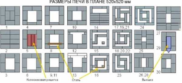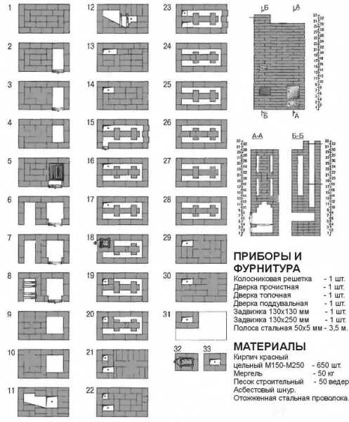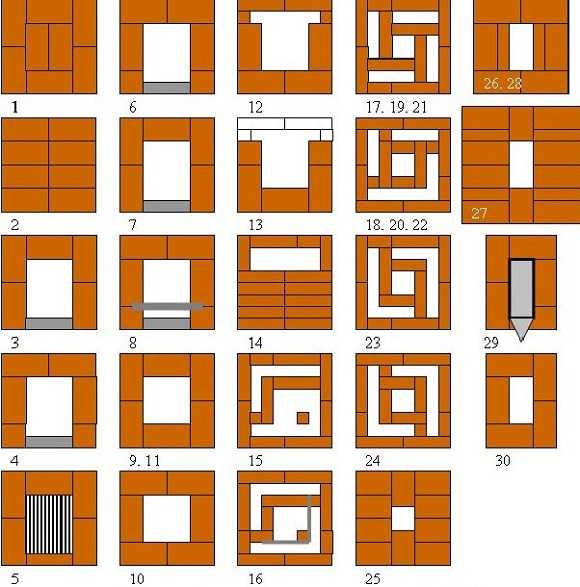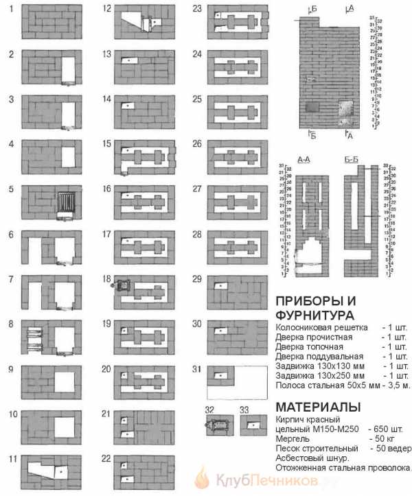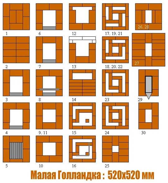 Русские печники освоили технологию кладки голландки более двухсот лет назад. За это время печка зарекомендовала себя в качестве надежного, экономичного и производительного отопительного агрегата. При этом голландка имеет предельно простую конструкцию. Изучив следующее руководство, вы сможете выложить ее собственными силами. Печь голландка своими руками Содержание статьи Для кладки голландки используется керамический полнотелый кирпич. Конструкция печи состоит из следующих основных конструктивных элементов: Схема печи голландки Среди ключевых отличий голландки от остальных популярных кирпичных печей нужно выделить: Стены голландки, как правило, выкладываются в кирпич. Благодаря этому готовая конструкция имеет сравнительно небольшой вес, что упрощает требования к фундаменту и в целом основанию. Отопительная печь голландка Компактные размеры печки позволяют вписать ее практически в любой интерьер. Огнеупорный кирпич Дверцы печные Колосник Асбестовый шнур Полоса стальная Несмотря на сравнительно небольшой как для кирпичной печи вес, голландка все равно нуждается в качественном и надежном основании. Отличный вариант – монолитная плита. Важный нюанс: фундамент должен быть армирован как по площади, так и по объему, т.е. вглубь. Размеры подобного основания должны быть не менее 1,2х1,2 м. Фундамент голландки нельзя связывать с основанием главного строения. Как сделать фундамент Фундамент под кирпичную печь Порядок работы по обустройству фундамента следующий. Первый шаг. Намечаем границы обустраиваемого основания. Второй шаг. Роем котлован глубиной примерно 60 см. Котлован для отливки фундамента Третий шаг. Засыпаем дно котлована 15-сантиметровым слоем щебенки. Тщательно разравниваем и утрамбовываем засыпку. Щебень Четвертый шаг. Укладываем сетку из арматурных стержней. Рекомендованный размер ячеек такой сетки – 100-120 мм. Котлован под фундамент с опалубкой и арматурой Пятый шаг. В местах пересечения прутков устанавливаем вертикальную арматуру. Связываем все стыки элементов опорной системы проволокой. Шестой шаг. Устанавливаем опалубку для заливки фундамента. Каждую стенку опалубки укрываем рубероидом либо обрабатываем смолой для гидроизоляции. Седьмой шаг. Заливаем бетон. Залитый бетон Восьмой шаг. Производим «железнение» поверхности основания. Для этого посыпаем заливку небольшим количеством сухого цемента. Даем фундаменту набрать прочность. Лучше оставить его на месяц, но многие мастера приступают к кладке уже через неделю. В этом моменте решение за вами. Прежде чем приступать к кладке, нужно приготовить раствор и выполнить несколько несложных мероприятий по подготовке фундамента. Просейте песок и разбейте большие куски глины. Измельченную глину также нужно просеять. С функциями сита прекрасно справится сетка от панцирной кровати. При отсутствии таковой используйте простое сито с ячейками аналогичных размеров. Залейте глину водой на несколько часов. Излишки воды, не впитанные глиной, сливайте. Важно! Замачивать нужно не только глину, но и кирпичи. Для этого достаточно погрузить их в воду примерно на минуту. Благодаря такой обработке кирпичи не будут поглощать воду из глиняного раствора. Дайте глине набухнуть и смешайте ее с песком в равных количествах. В эту же смесь добавьте примерно 1/8 часть чистой вод