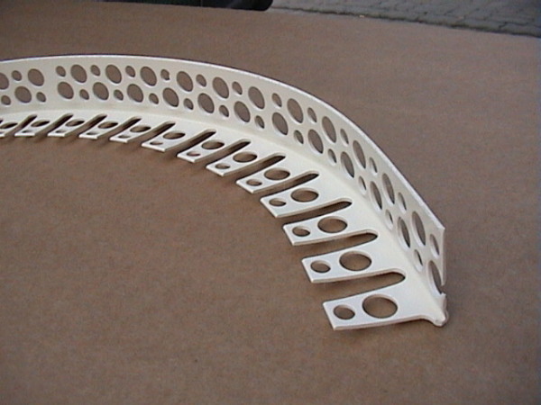 Чаще всего для изготовления арочных уголков используется поливинилхлорид. Одна поверхность такой конструкции имеет отверстия (т.е. перфорирована), а другая снабжена так называемыми «лепестками». За счет этого конструкция очень пластична и ей можно придавать любую, даже самую вычурную форму.