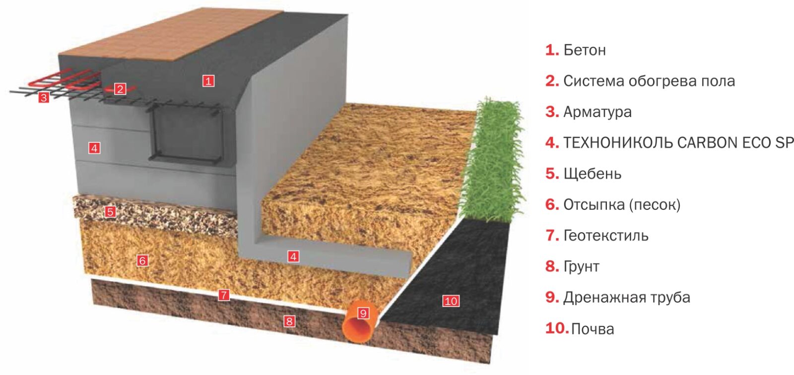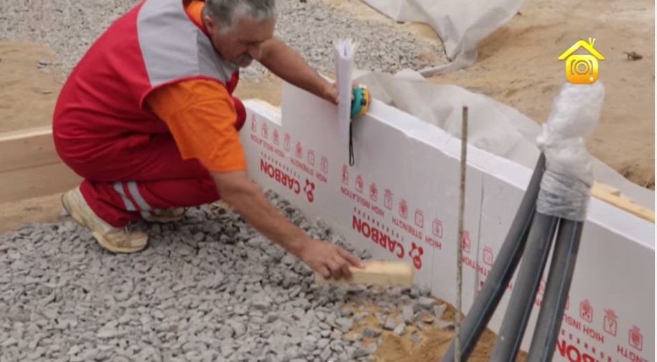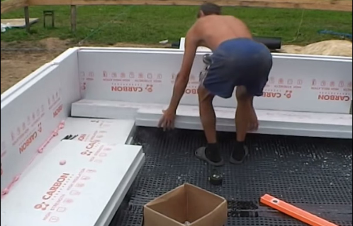 Укладывается теплоизоляция из экструдированного пенополистирола (ЭППС) по всему периметру слоем 20-30 см и сбоку, в качестве несъемной опалубки. Если применять карбоновый утеплитель, то он будет лучше выдерживать большие сжимающие напряжения. Его кладут в два слоя с промежуточной гидроизоляцией из пленки ПВХ. На кромках должны быть выступы, предотвращающие образование мостиков холода в местах стыка.
