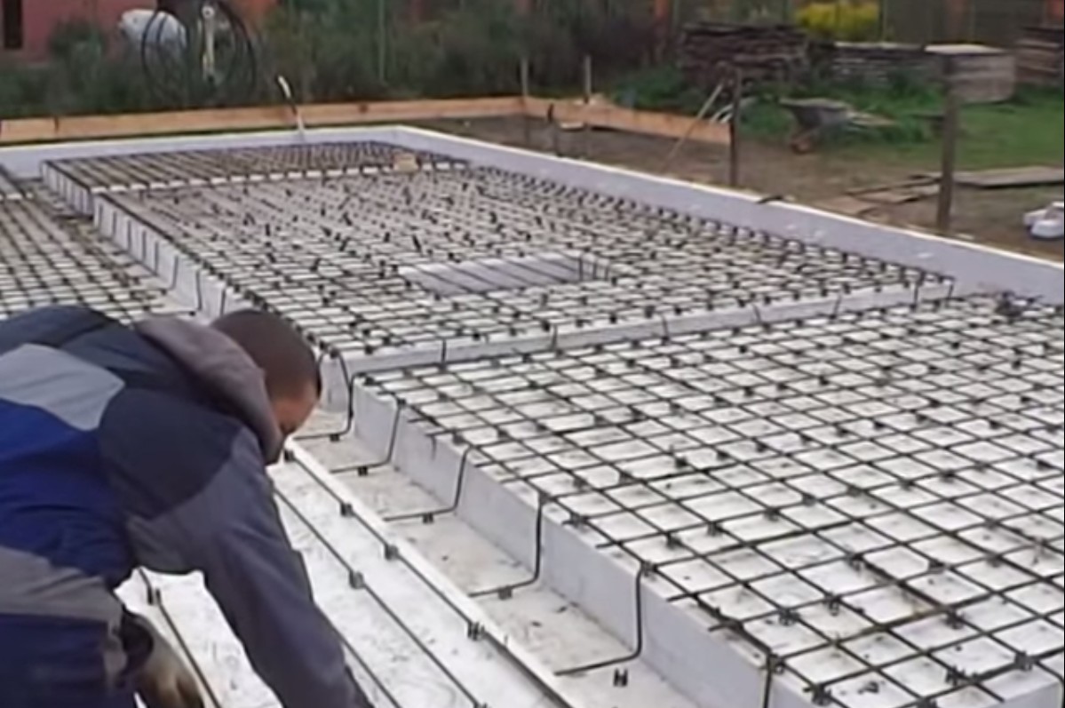 Общий принцип строительства УШП можно описать следующим образом: это некое огромное «корыто» из пенопласта «фундаментных» марок (способных выдержать большие нагрузки при небольшой относительной деформации). Корыто, представляющее из себя несъемную опалубку, собирается на подготовленной песчано щебеночной подушке обеспечивающей дренаж. Затем в этом корыте укладывается арматурный каркас и сетка, к которой, согласно планировке помещений, закрепляется труба для водяных теплых полов и раскидываются другие коммуникации — водоснабжение, канализация и иногда электрика. Затем все это заливается бетоном и по хорошему, затирается «вертолетами» для получения максимально готовой под финишную отделку поверхности плиты. Важно так же отметить, что плита не простая, а с ребрами жесткости под несущими стенами. То есть толщина плиты отличается под несущими стенами от остальной поверхности.