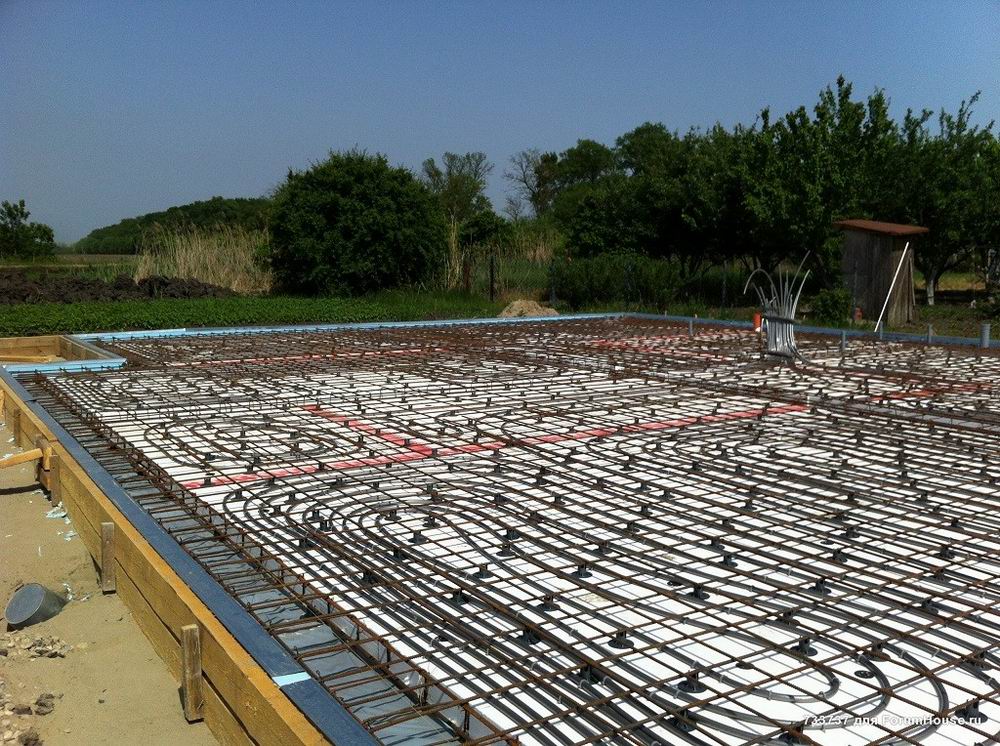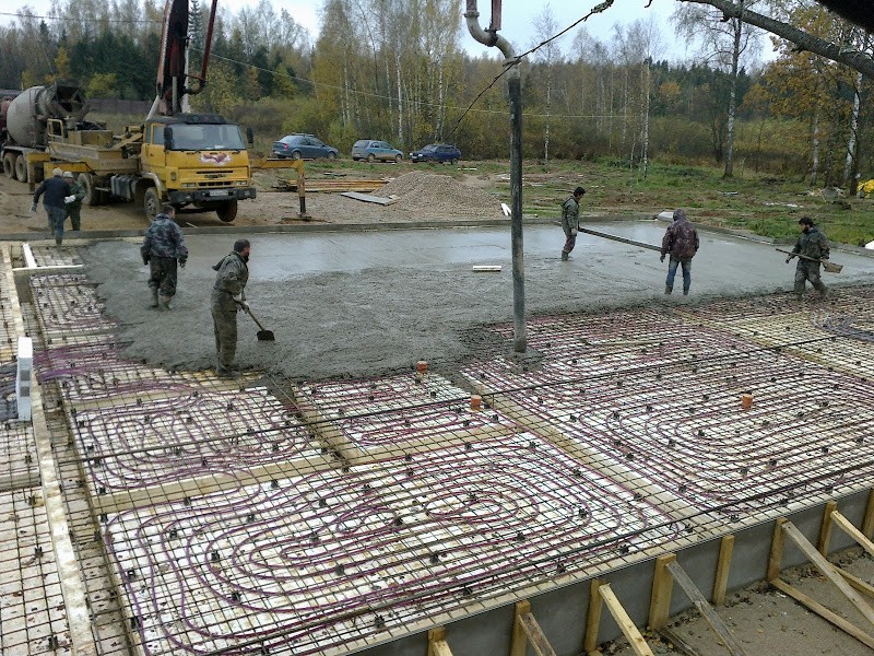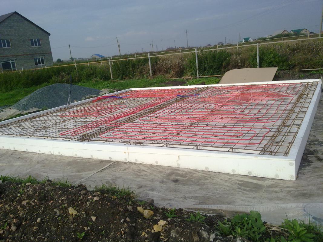 Что касается теплых полов при устройстве данного фундамента: Разводка труб теплых полов уже может производиться на этапе его возведения. Трубы теплого пола хомутами крепятся к арматуре, которая располагается в нижней части плиты. И в результате после заливки вы получаете готовый фундамент в котором находятся трубы теплого пола, а значит вам не нужно будет делать классической системой устройство теплых полов по утеплителю, когда по монолитной плите дома устраивается утеплитель, закладываются трубы теплого пола, делается стяжка, и в результате вы тоже получаете теплый пол, но за эти работы дополнительно платите деньги.