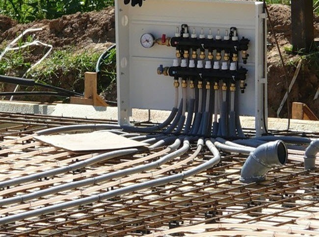 Материалом служат специальные полиэтиленовые трубы, максимально устойчивые к нагрузкам, не подверженные химической реакции при соприкосновении с растворными смесями. Раскладка осуществляется отдельными контурами по помещениям будущего строения. В этом случае можно легко регулировать температуру в каждой комнате, открывая/закрывая соответствующий клапан коллектора. Раскладывают «теплый пол» змейкой или улиткой. Концы труб подсоединяют к коллектору и заполняют воздухом или незамерзающей жидкостью. Под давлением трубки легко перенесут нагрузки от слоя бетона и не повредятся.