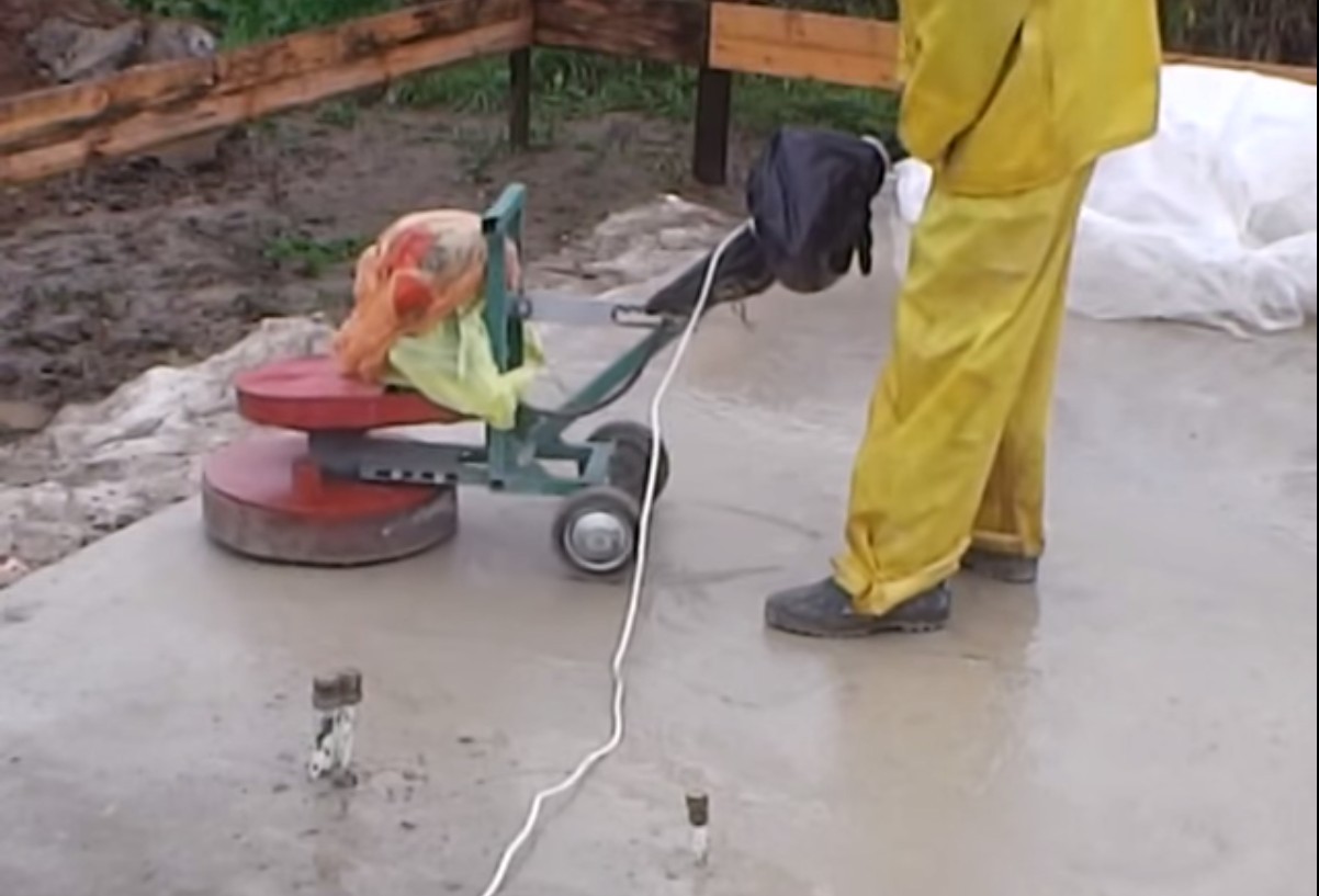 Необходимо отметить, лучше использовать заводскую смесь доставленную машинами. С помощью бетононасоса раствор равномерно распределяется по всему основанию. Глубинными вибраторами удаляются воздушные пузырьки, и бетон разравнивается по горизонтальному уровню. Устройство плиты «в одну заливку», позволяет избежать швов, делая фундамент монолитным. Толщина бетонного слоя 10 см. Далее поверхность плиты шлифуется до идеального состояния.