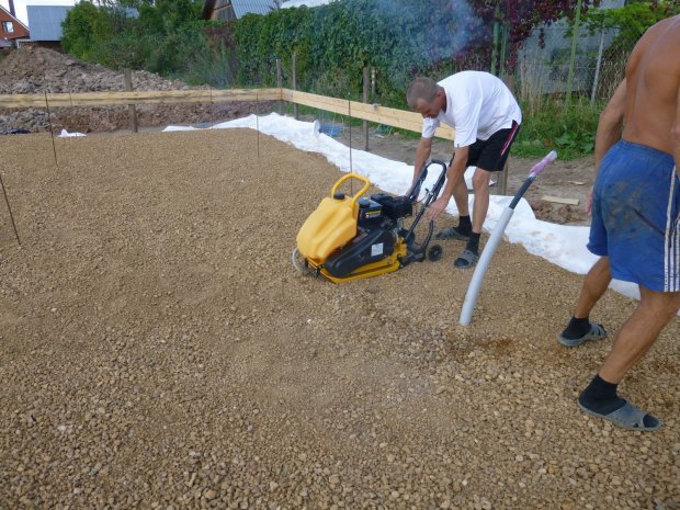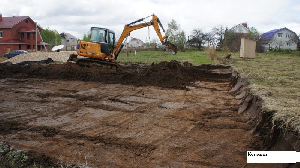 удаляется верхний слой почвы. Если есть желание сэкономить, то можно выполнить эту работу лопатами. В противном случае нанимается экскаватор. Дно котлована выравнивается в горизонте.