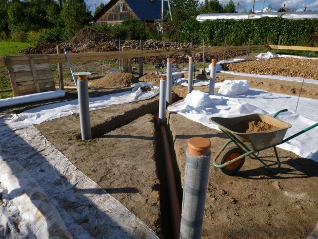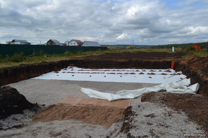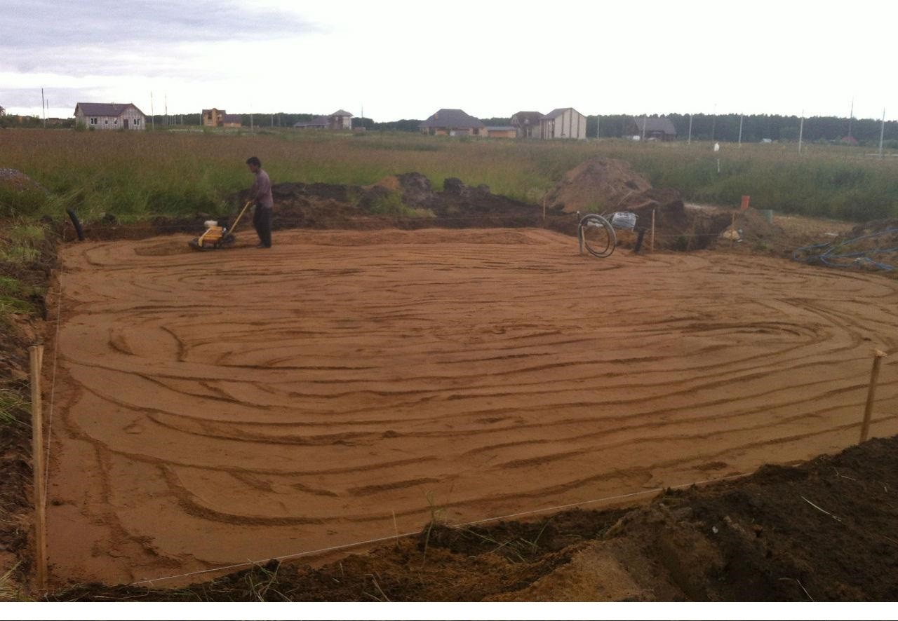 На выровненный грунт выстилается геотекстиль и засыпается песком слоем в 15 см. Он трамбуется и на него укладываются дренажные трубы (по периметру дома и под плиту), прокладываются коммуникации. Они засыпаются песком, который поливается и послойно уплотняется.