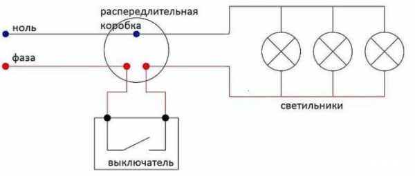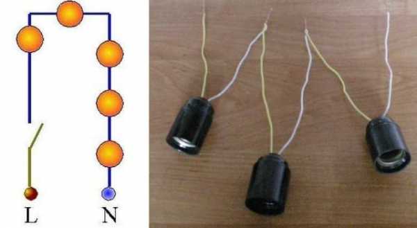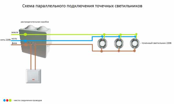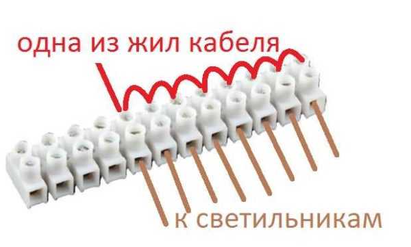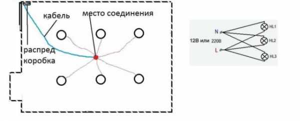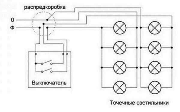 После того как составили план расположения точечных светильников на потолке, в подсветке шкафа, приходится задуматься об их электрическом подключении. Как подключить точечные светильники, по каким схемам, какими проводами и кабелями — обо всем этом дальше. Содержание статьи Подключить точечные светильники можно последовательно, хотя это — не лучший выход. Несмотря на то, что этот тип соединения требует минимального количества проводов, в быту он практически не используется. Все потому что имеет два существенных недостатка: Принцип последовательного соединения Именно по этим причинам такой тип подключения применяется исключительно в елочных гирляндах, где собрано большое количество маломощных источников света. Можно, конечно, первый недостаток использовать: подключить последовательно к сети 220 В лампочки на 12 В в количестве 18 или 19 штук. В сумме они дадут 220 В (при 18 штуках 216 В, при 19 — 228 В). В этом случае не понадобиться трансформатор и это плюс. Но при перегорании одной из них (или даже ухудшении контакта), искать причину придется долго. И это большой минус, который сводит на нет все положительные моменты. Схема последовательного соединения лампочек (точечных светильников) Если вы решили подключить точечные светильники последовательно, сделать это просто: фаза обходит все светильники один за другим, ноль подается на второй контакт последней лампочки в цепи. Если говорить о фактической реализации, то фаза от распределительной коробки подается на выключатель, оттуда — на первый точечный светильник, со второго его контакта — на следующий…. и так до конца цепочки. Ко второму контакту последнего светильника подключается нулевой провод (нейтраль). Схема последовательного подключения точечных светильников через одноклавишный выключатель У этой схемы есть одно практическое применение — в подъездах домов. Можно параллельно подключить две лампочки накаливания к обычной сети 220 В. Они будут светиться в пол накала, но перегорать будут крайне редко. В большинстве случаев используется параллельная схема подключения точечных светильников (ламп). Даже несмотря на то что требуется большое количество проводов. Зато напряжение на все осветительные приборы подается одинаковое, при перегорании не работает одна, все остальные — в работе. Соответственно, никаких проблем с поиском места поломки. Схема параллельного подключения точечных светильников Есть два способа параллельного соединения: Способы реализации параллельного подключения Лучевая схема подключения более надежна — если проблемы случаются, то не горит только эта лампочка. Есть два минуса. Первый — большой расход кабеля. С ним можно смириться, так как делается проводка один раз и надолго, а надежность такой реализации высокая. Второй минус — в одной точке сходится большое количество проводов. Качественное их соединение — непростая задача, но решаемая. Соединить большое количество проводов можно при помощи обычной клеммной колодки. В этом случае с одной стороны подается фаза, при помощи перемычек она разводится на нужное число контактов. С противоположной стороны подключаются провода, идущие к лампочкам. Способы соединения проводов при лучевом исполнении Практически так же можно использовать клеммники Ваго на соответствующее число контактов. Выбрать надо модел
