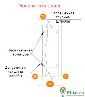 Основываясь не на прямой запрет на штробление стен в монолитном доме, а на пункты нормативов, запрещающие любые изменения конструкций могущих повлиять на их эксплуатационные качества, разумно ограничить устройство скрытой проводки связанной со штроблением так. Нельзя делать штробы: