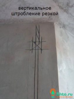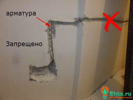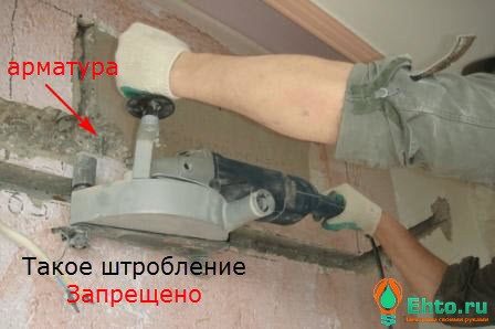 Примечание: если нет возможности избежать изготовление штраб в несущих стенах монолитного дома, делается это без затрагивания вертикальной арматуры в монолите бетона. Глубина штраб должна быть минимальной, около 30 мм. Для изготовления штрабы используется метод вертикальной резки бетона с минимальным долблением под углом.