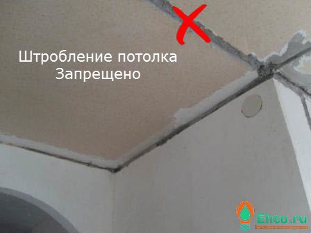 Эта опасная операция может стать реальной угрозой жизни не только вашей жизни, но и жизни всех жильцов дома.В таком случае, если необходимо поменять расположение проводки, лучше не штробить потолок, а замаскировать кабеля слоем штукатурки.
