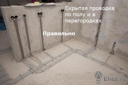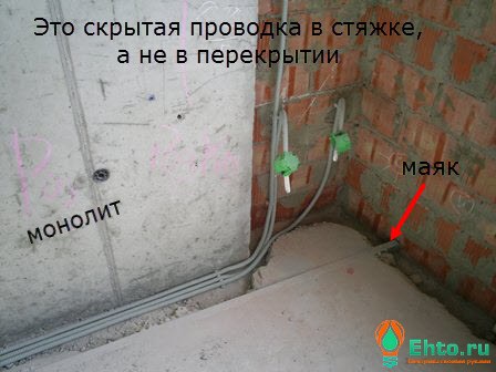 1. Скрытая проводка монолитного дома делается в полу в трубах или электротехнической гофре, с последующим укрытием стяжкой пола;