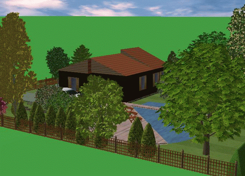 Дальше остается только полностью распланировать структуру и подобрать декорации из библиотеки (достаточно большой выбор моделей). В качестве примера возьмем наш участок и выставим дом (размеры каждого объекта можно изменять, например, указать наклон, габариты и др.).