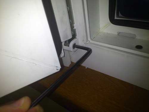 Этот нюанс можно решить подкрутив болт на навесе. Начинаем все с нижнего навеса, только на этот раз ищем болт сбоку. Подбираем ключ и делаем несколько поворотов обратно же по часовой стрелке. Такая процедура подтянет полотно к навесу и автоматически отодвинет от свободного края коробки.