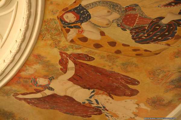 Плафон в зале и занавесы расписаны по эскизам Леона Бакста, но в редакции Церетели, в чьей мастерской они и были расписаны. Оно и видно невооружённым глазом, что Церетели