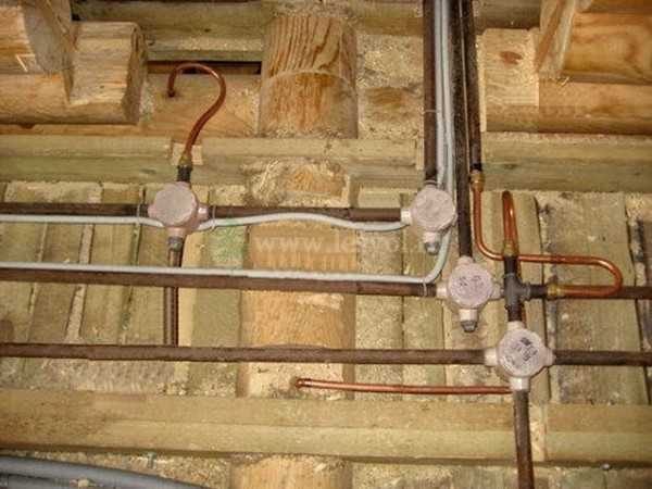 Скрытая проводка в медных трубкахНаружная электропроводка считается более безопасной, так как для нее используются кабели с шелковой и ПВХ-пластиковой изоляцией. Конструкция подразумевает наличие зазора между самим кабелем и поверхностью. Соответственно, когда ток будет бежать по проводам, а те будут разогреваться, на поверхность деревянной стены будет оказываться минимум теплового воздействия.