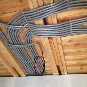 При проведении скрытой проводки в деревянном доме своими руками по любого рода перекрытиям не стоит делать какие-либо послабления и в обязательном порядке размещать кабеля в специальных трубах. К тому же, проведение проводки по перекрытиям считается наиболее удобным способом устройства проводки скрытого типа. Штробы, предназначенные для выключателей и розеток, необходимо спускать от самих магистральных кабелей.