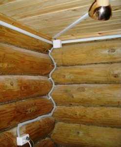 Если деревянный дом имеет гладкие внутренние стены, то можно приобрести ПВХ-коробки, куда спрячутся все проводки, но если дом выстроен из бруса, то лучше отдать предпочтение гибкому кабелю.