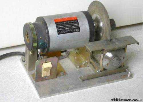 Основание станка должно быть массивным, чтобы тяжелый мотор не опрокинул конструкцию. Установив на патрон и электромотор шкивы нескольких диаметров, можно регулировать скорость вращения.