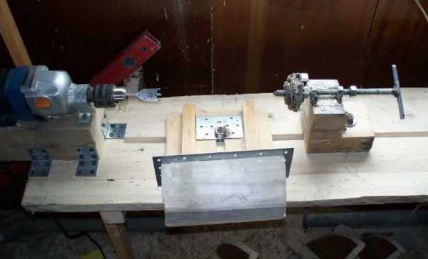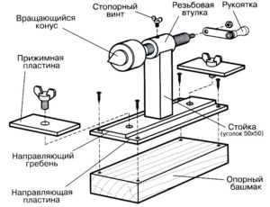 Зажимной шпиндель для деревянных заготовок не обязателен. Равно как и отдельный двигатель привода. Есть простое комплексное решение – электродрель.