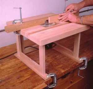 Сложность инструмента зависит от вида производимых работ. Для элементарной торцевой обработки достаточно просто установить ручной фрезер под ровную столешницу. Электроинструмент крепится вверх ногами, рабочая насадка выступает над поверхностью. Такие самодельные станки широко распространены среди домашних мастеров.