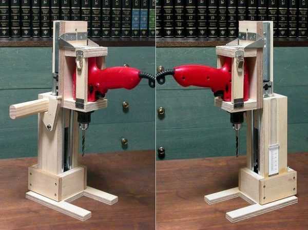 Есть и более сложные конструкции. Если установить надежный подвес для ручного фрезера, вы сможете выполнять сложную фигурную обработку, в том числе и по шаблонам.Самодельные сверлильные станки. Есть удобные приспособления для дрели, которые превращают ручной инструмент в стационарное оборудование. Но такие стойки опять же стоят денег.