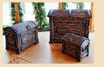 Декорирование. Пиратский сундук уже фактически готов, осталось его украсить. Для этого на крышку накладывается трафарет. Картинка может быть любой: корабль, якорь и тому подобное. Сверху наносится белая краска, трафарет убирается – и рисунок оказывается на поверхности. Вся внешняя поверхность покрывается воском с добавлением золотой пудры и шлифуется с помощью мягкой ткани, после чего наносится тонкий полупрозрачный слой черной краски. Изнутри сундук с помощью клея для сусального золота обтягивается поталью.