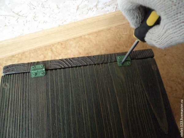 Прикрепите петли. С их помощью отпиленная крышка присоединяется к основанию. С другой стороны привинтите петлю, на которую можно повесить замочек.