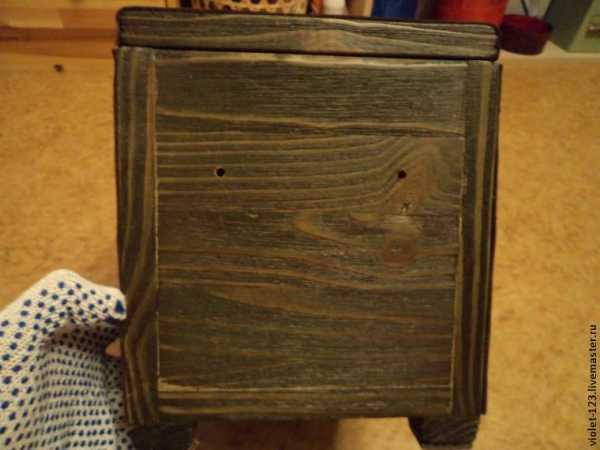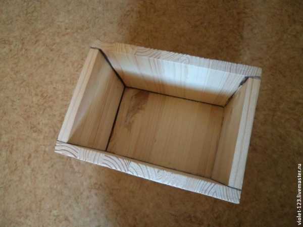 Украшением нового предмета мебели послужат ромбы из тонированных планок, собранные на ус при помощи термоклея. Просушенные рамки шлифуем, покрываем морилкой, а затем лаком. Цвет накладок должен совпадать с цветом ножек, чтобы сундучок имел законченный вид. Готовые накладки приклеиваем к стенкам короба.