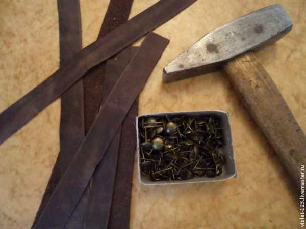Приступаем к отделке изделия кожаными ремешками. Для этого нам понадобиться: кожа размером 50*50 см., люверсы внутренним диаметром 4мм., клепочник для люверсов, пробойник с диаметром 4 мм., две бляшки размером 3*3 см., декоративные,обивочные гвозди.