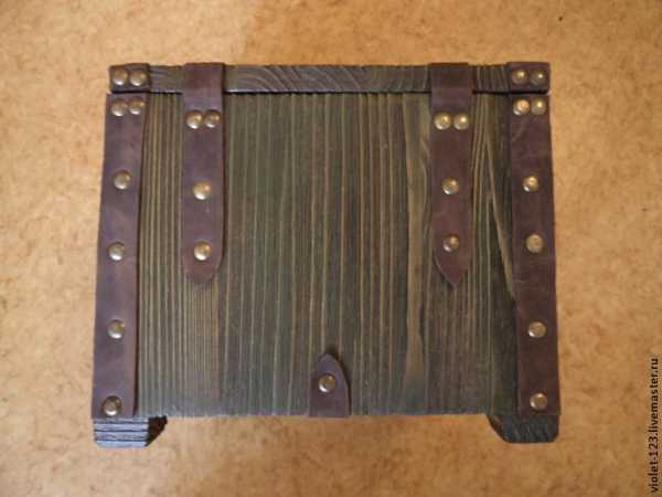 Завершить декорирование сундука лучше всего кожаными полосками, прибитыми стилизованными гвоздями с большими шляпками.