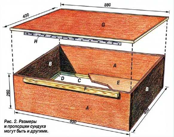 Сначала нужно определиться с местом, где в дальнейшем расположится наш новый предмет мебели, и высчитать желаемые габариты короба. Затем построить чертеж с указанием всех параметров изделия. Предлагаемый к изготовлению сундук своими руками хорош тем, что не занимает много площади и может разместиться в любой комнате.