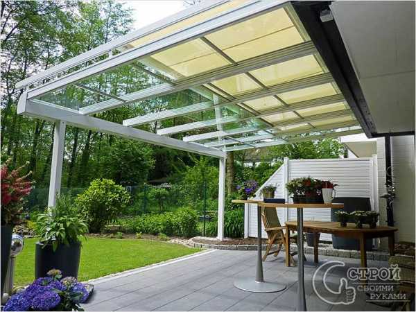 Если веранда используется в основном в теплое время года, можно обустроить съемную кровлю. Такая конструкция представляет собой тканевый навес, который выдвигается и задвигается под крышу дома вручную или в автоматическом режиме.