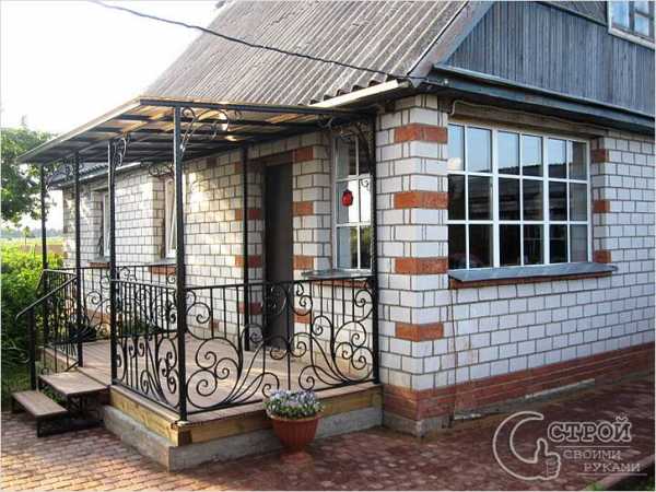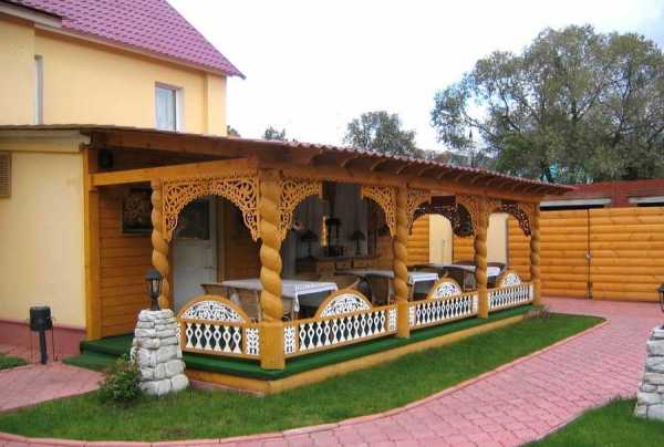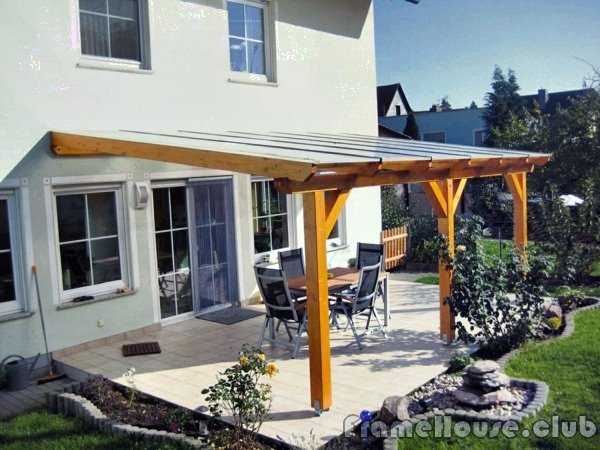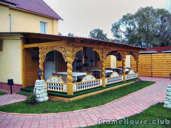 Форму площадке, как правило, придают прямоугольную, крышу, накрывающую ее, делают односкатной, опирающейся тыловой частью на стену дома, а передней – на вертикальные деревянные стойки.