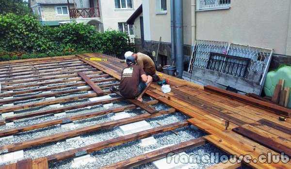Если же встает вопрос о том, как сделать террасу прямо на грунте, то можно ограничиться меньшим объемом работ. Сначала очищается строительная площадка, с нее снимается верхний слой почвы, производится отсыпка из гравия или щебня (можно вместе с песком), а для большей прочности – сверху заливается тонкая стяжка. Для устройства настилов допускается укладка и непосредственно на грунт, но в этом случае, такое сооружение можно считать временным, так как срок его службы ограничен, даже если древесину обработать соответствующим образом.