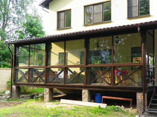 Для того чтобы сделать террасу закрытой, потребуется подготовить каркас для ее будущих стен. Изготовить его можно как из деревянного бруса, так и из металлических стоек. Первый вариант более предпочтителен, так как меньше нагружает сооружение, кроме того, не требует привлечения для сварочных работ специалиста. Монтаж начинается с установки вертикальных стоек, которые должны иметь перевязку в нижней и верхней части. Если конструкция пристраивается к деревянному дому, то для крепления можно использовать болтовые соединения или саморезы.
