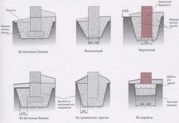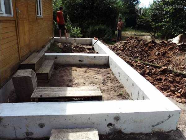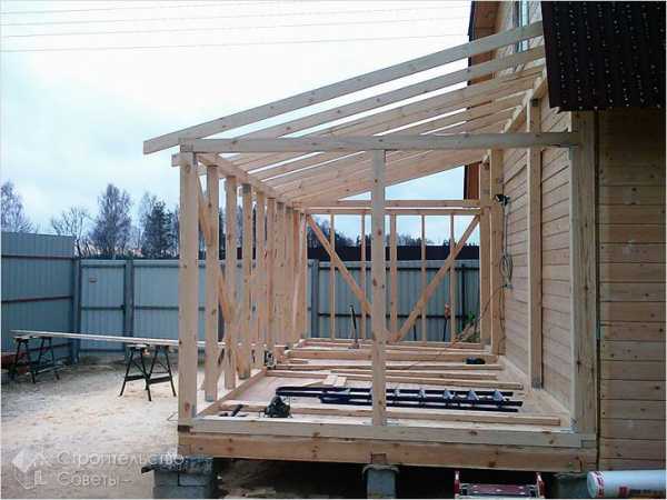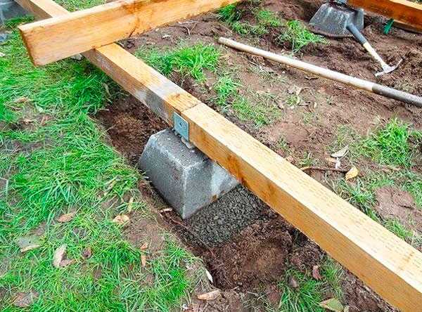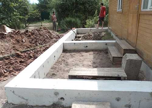 Если постройка примыкает к дому, то фундамент у нее может быть единым: ленточным или столбчатым. Настилу на нем необходимо придать небольшой наклон от дома, чтобы осадки стекали в почву, и не намокала несущая стена.