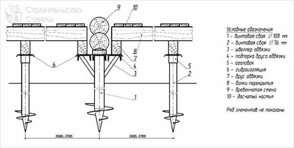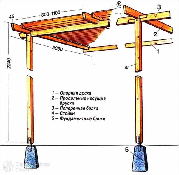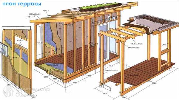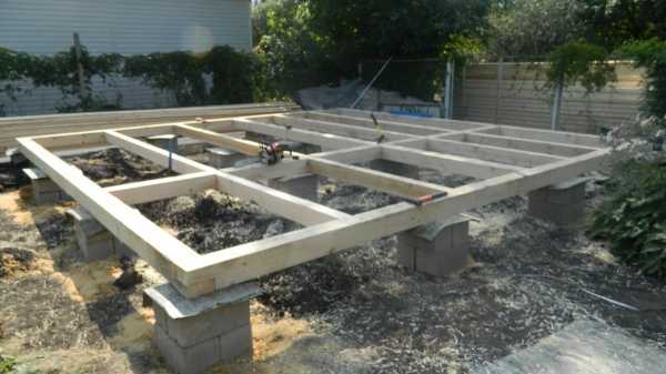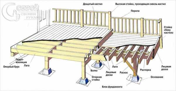 Схема строительства террасы В случае отдельного расположения террасы достаточно будет установить столбы из труб или кирпичей с верхней обвязкой и лаги на них как основание для пола.