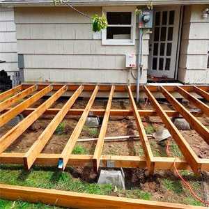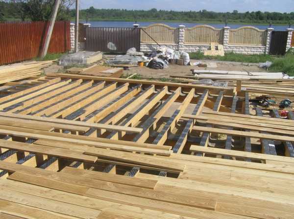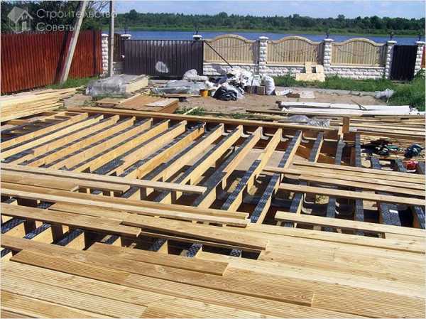 Обязательно при этом надо проверить качество обработки деревянного бруса антисептическими, гидрофобными и огнестойкими пропитками, уделяя при этом особое внимание торцовым частям. После укладки лаг и в том случае, если предусмотрена установка ограждения или устройство каркаса для закрытой постройки, приступают к монтажу этих элементов. Если сооружение возводится как открытая терраса своими руками, то следующий шаг – укладка досок настила.Изготовление каркаса террасы