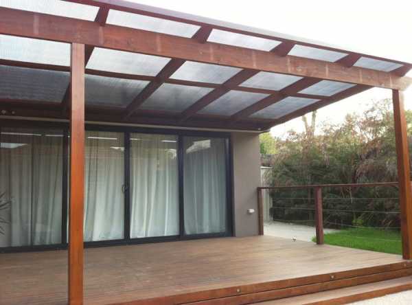 Еще один вариант, пригодный для сборки своими руками – терраса с оградой и навесом из поликарбоната. Легкий и прозрачный материал убережет от осадков и грязи, не затемняя помещение внутри. Современные марки не боятся сильных морозов и могут эксплуатироваться круглый год. Недостаток – в сильную жару постройка под поликарбонатной кровлей превращается в подобие теплицы и нуждается в хорошем проветривании.