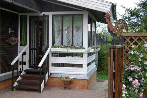 Чтобы внести в интерьер пристройки некую изюминку, можно декорировать площадку различными цветочными композициями, высаженными по периметру. Чтобы добиться не только декоративного эффекта, но и защиты от ветра, с наиболее ветреной стороны можно высадить ряд туй.