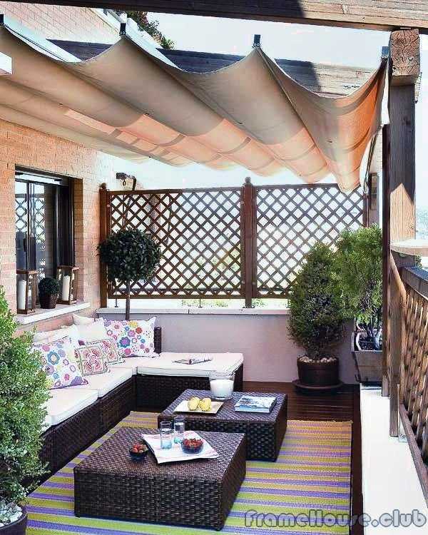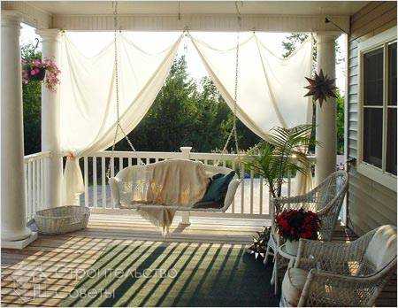 Для придания террасе некоторой закрытости подвешивают тюль, собирая их в пучки или распуская, в зависимости от настроения. Оформление тюлем особенно часто используется в пристройках средиземноморского стиля.