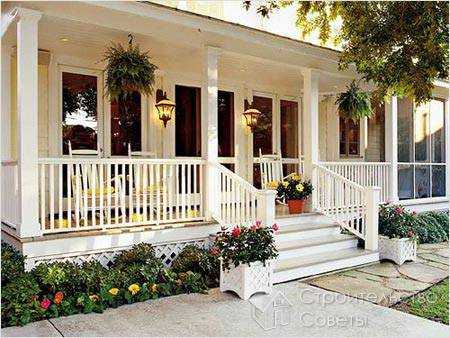 Если с южной стороны дома есть выход на улицу, то наиболее оптимальным будет вариант пристроенной веранды. В ней можно будет недолго отдыхать даже зимой. Если же вход в дом расположен с севера, то на пристроенной с данной стороны террасе будет довольно прохладно, хотя в летнюю жару это весьма кстати. В таком случае чаще всего возводят пристройку, огибающую дом со всех сторон.