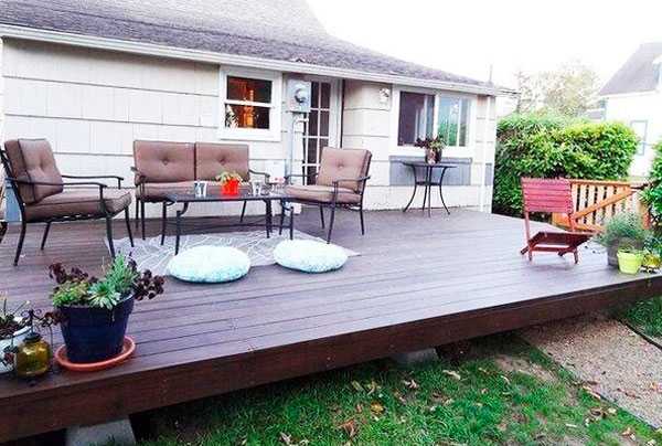 Оградите террасу перилами, соорудите ступеньки, ошкурьте детали конструкции мелкой наждачной бумагой и покройте их водостойкой краской, яхтным лаком или специальной восковой мастикой.