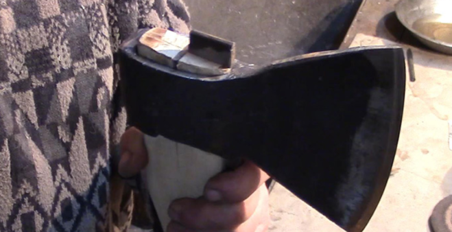 Заливаем в пропилы, смолу. Количество должно быть таким чтобы заполнилась 1/4 глубины. Но делать это надо только после насадки топора, чтобы смола не вытекала. Наполнение смолой пропилов имеет большой смысл. Довольно часто, особенно если сделан пропил недостаточной глубины, при забивании клина топорище даёт незаметную трещину(а иногда и очень заметную), внутри проушины. Трещина может дать о себе знать позднее, в самый неподходящий момент. Так вот смола заполнит трещину и не даст ей развится. Ну и в целом она так же позволит не оставить пустот в щели после забивания клина. Натираем клинья эпоксидной смолой и акуратно забиваем, вначале поперечные. А затем и вертикальные.